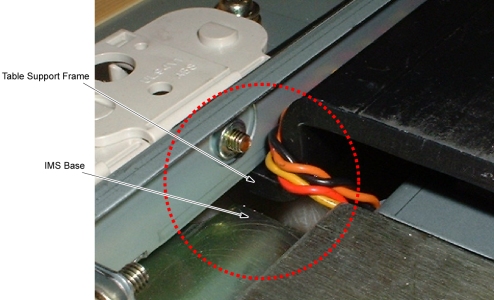 2. Move the IMS to mechanical IN limit position by hand, and verify that the motor wires are not caught between the IMS base and the Table support frame.