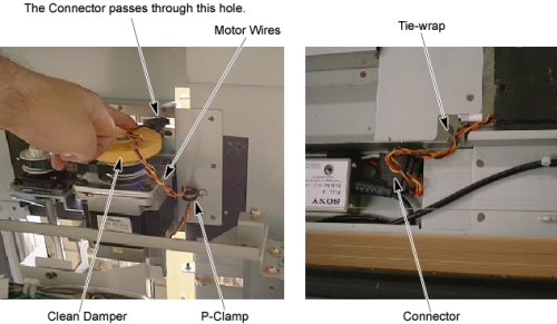 2. Route the motor wires through the p-clamp as shown in illustration below, and re-connect the motor wires connector, then fasten the wires to the Table bracket with tie-wraps.