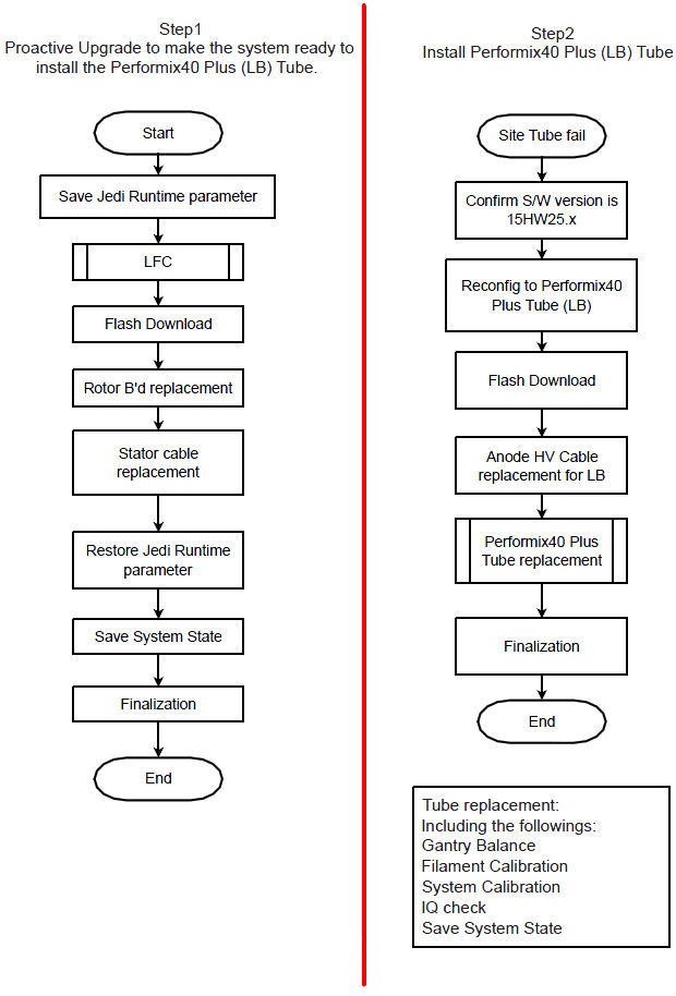 There are two procedures. Two-Step upgrade procedure is used when LB Tube installation is done separately from Software upgrade and other hardware modification. One-Time upgrade procedure is used when both of Software upgrade, hardware modification and LB Tube installation are done at the same time.