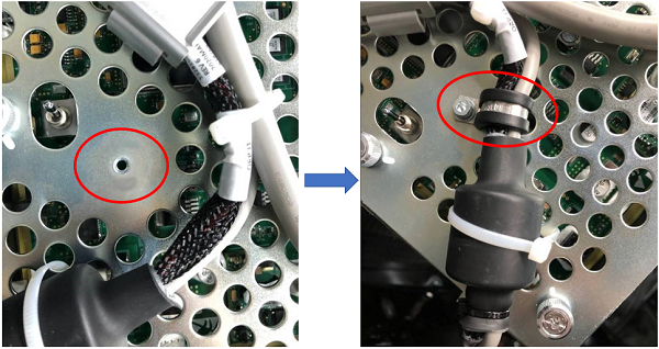 note: For cable 5328105-2, fixed in the cover with metal loop (46-208718P5), by using M4 hex screw (1000-M4C010-04), lock washer (2203-M4-07) and flat washer (2000-M4-02), apply torque of 2.3Nm. See Figure 4.Figure 4. Fixed with metal Loop