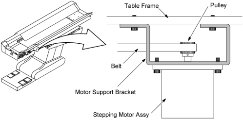 7. Remove the four screws that fasten the stepping motor to the motor support bracket, and remove the drive belt from the stepping motor pulley, and slide stepping motor out of the motor support bracket.