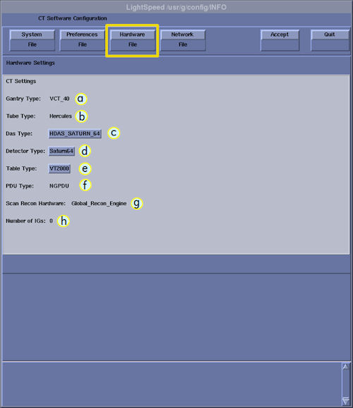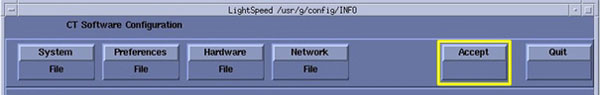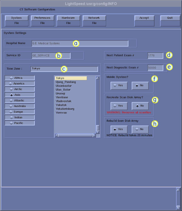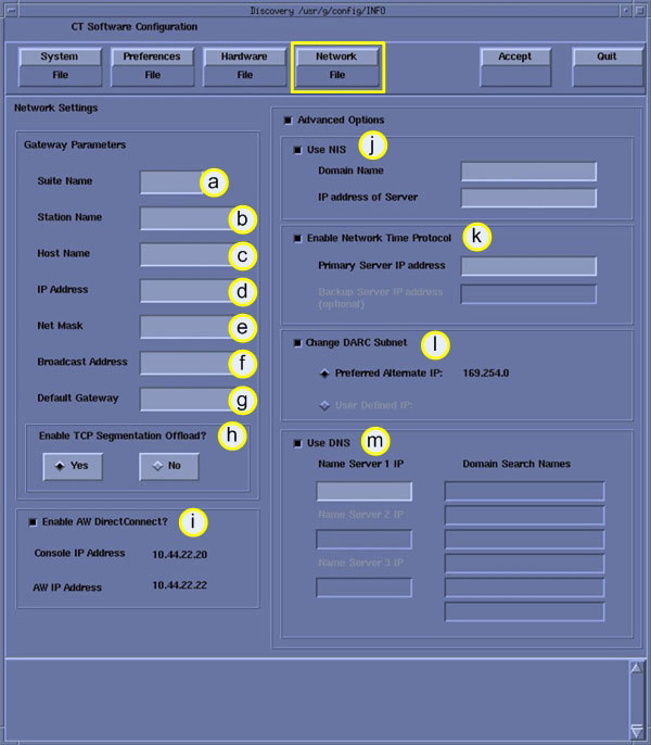 note:This screen provides the ability to declare the CT system on a hospital network. Key information such as Host Name, IP Address, Net Mask (for CT systems on a subnet) must be obtained from the hospital network administrator.