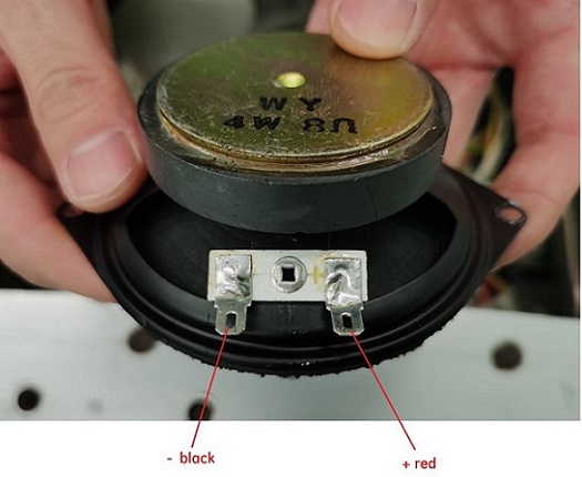 - Take out a new speaker, use the magnet on the speaker to fix it in an easy-to-operate position, then reconnect two wire leads.