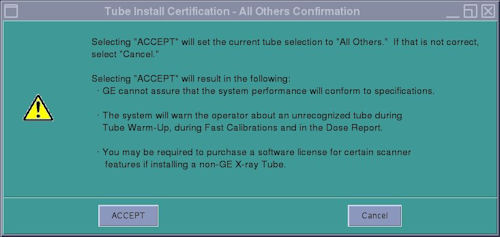 For GE Medical Systems Tube configuration, the Tube Install Certification Tool displays the number of Days Remaining in the Trial Period. A certified GE Field Service Engineer must confirm the tube identity during the trial period. If the trial period expires before a certified GE Field Service Engineer confirms the tube identity, the system will automatically default to "All Others" functionality.