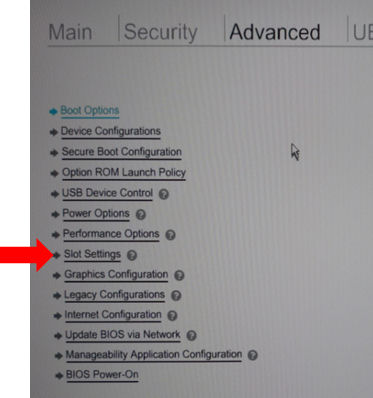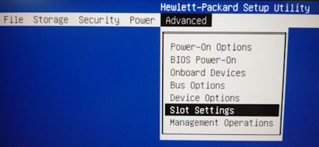 - In Hewlett-Packard Setup Utility, select Advanced → Slot Setting.