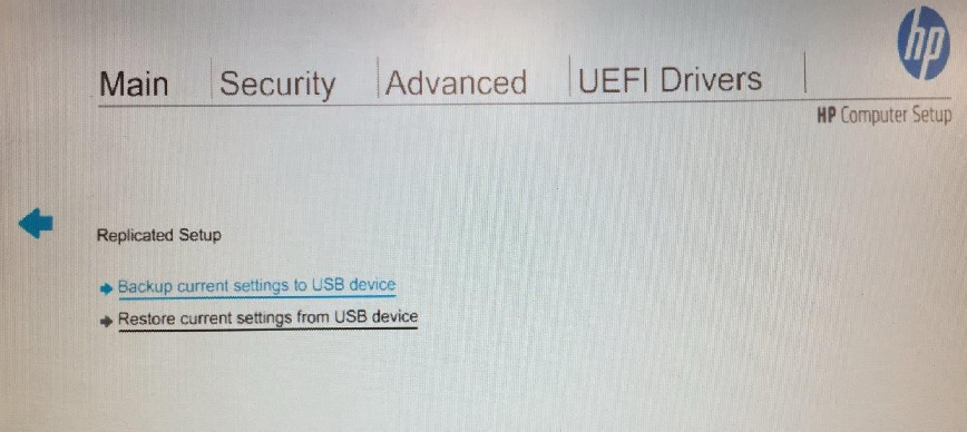 - From Computer Setup (F10) Utility menu, select Main > Replicated Setup > Back up current settings to USB device.
