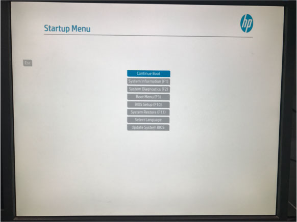 - When the display is active and Press the Esc Key for Startup Menu appears at the bottom of the screen, press F10 or Esc.