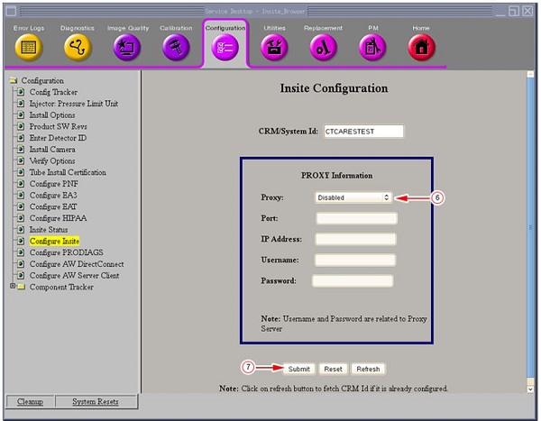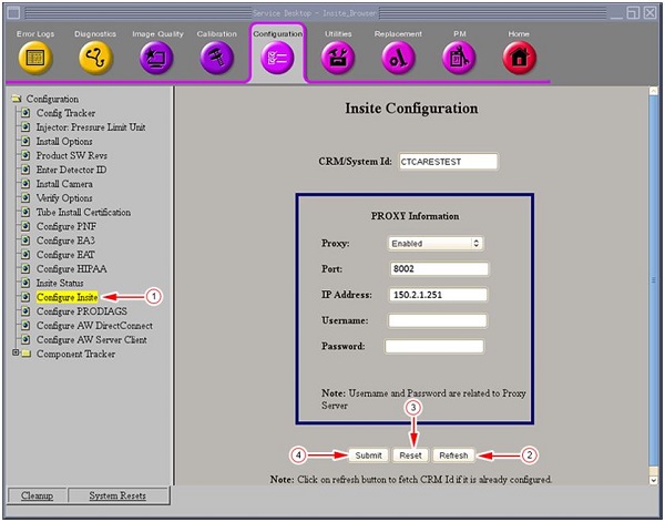 note: The Configure Insite page is used to submit an RSvP connection request. The required data entry depends on the customers network configuration with DNS and possible Proxy Server. Enter the customer network information into Insite Configuration input fields, that correspond to customer configuration. - Enter the CRM/System Id, [1]. This id must match the entitled system id. Refer Figure 3.