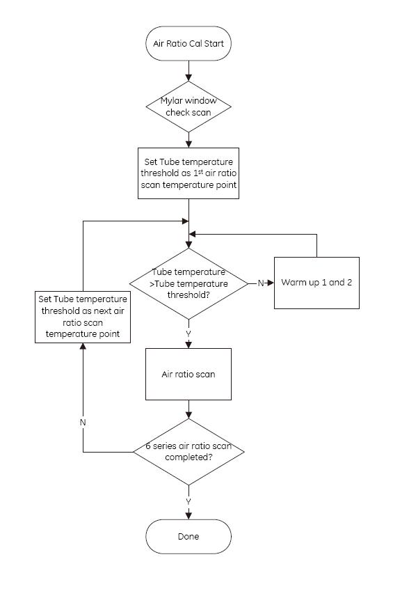 The calibration does air scan series from cold to hot tube temperature. There are 6 tube temperature thresholds for air scan. To certain temperature, the air scan sets will be performed. After completed scan at this temperature point, air ratio warmup 1 and air ratio warmup 2 scans will be used to warm up the tube to higher temperature for next air ratio scan temperature.