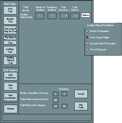 The auxiliary channel test primary function is to query the DCB and report specific data, such as detector temperature, power supply voltage, converter board temperature, and KV/mA readings as a function of the DCB. With the exception of the KV/mA channel sub-test, this test uses basic firmware routines to communicate and query the DCB. It does not use the Scan Acquisition process that DDC uses. The reason is that if the DAS fails power-up diagnostics, the error is reported to software and scanning is prevented, either in applications or Diagnostic Data Collection (DDC). This “tool” allows the user to query the DCB and read the supply voltages, or detector / converter board temperatures “real-time”. The only exception is if the 5 vdc digital supply is so low as to not let the DCB function at all, or if the DCB cannot communicate with the HEMRC Controller board in the OBC.