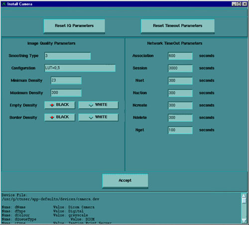 A second screen, Figure 3, with image quality and timeout information parameters for filming sessions, comes up after selecting ACCEPT. Figure 3, below, is an example of the required image quality and timeout parameters for a DICOM Print Camera: