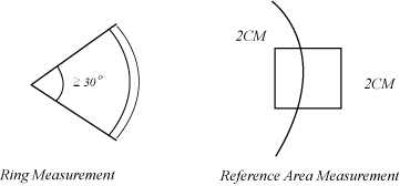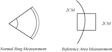 Measure the ring using ROI by placing two elliptical arcs surrounding the ring and taking care to include only pixels that are on the ring. The image may be magnified to accommodate this measurement. Next, measure the background mean CT number of the normal or magnified image by using a 2cm x 2cm box ROI directly centered about the ring or partial ring.