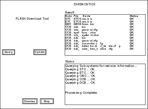 After the tool is invoked from the Service Desktop Manager, the FLASH Download Tool screen appears (see Figure 1). By default, all five nodes are selected at startup. The user selects QUERY to simply query the nodes and selects UPDATE to query, update, and then re-query the nodes. The Node, File Name, and Status are presented to the user in the Results window whenever a query is done. The Result and Status areas in the illustration below show the result of a successful query.