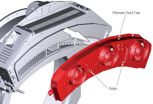 Hold the grips on the plenum with both hands, and remove the plenum duct fan straight away from the gantry to avoid bending the plenum alignment pins on either side of the plenum.
