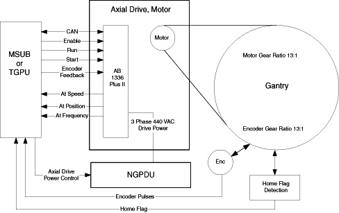 The MSUB (or TGPU) implements many of the sub-functions of the axial control system. The hardware involved in the axial servo drive consists of the MSUB (or TGPU), the Axial Motor Drive, the Axial Motor, Axial Motor Dynamic Brake Assembly, Axial Encoder, Axial Drive Belt and Axial Home Flag. See Figure 5.