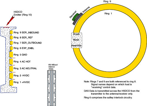 The system utilizes one HSDCD ring and nine hard wired slip rings. Five rings provide AC and DC power and ground; one provides interlock signal for the HV subsystem; and three provide the communication path between the stationary and rotating components. Only the three communication rings will be discussed here.