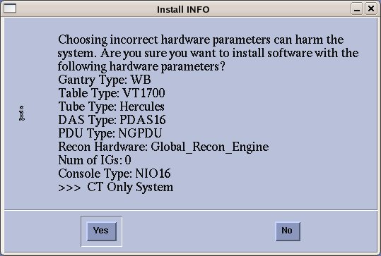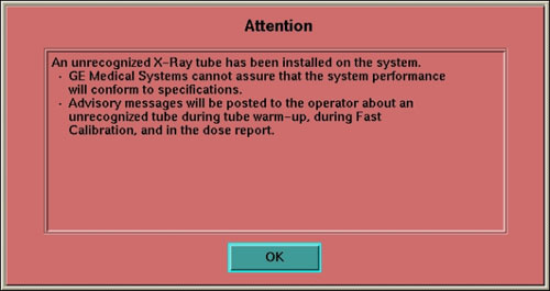 If the tube selection is GE with time limit, a message with days remaining for GE FE to verify tube will be shown on boot up until GE FE removes the time limit with service key. If not verified by GE FE within the time limit, the system will default to 'All Others'.