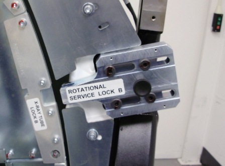 When the system is powered up, the axial drive controls the rotating assembly; however, when the gantry is powered off, the rotating assembly is free to rotate. The rotating assembly is a tightly balanced set of components. Removal of any item will cause the rotating assembly to suddenly turn. Use a rotational service lock and a labeled index position to prevent rotation and provide service access.