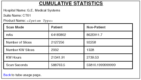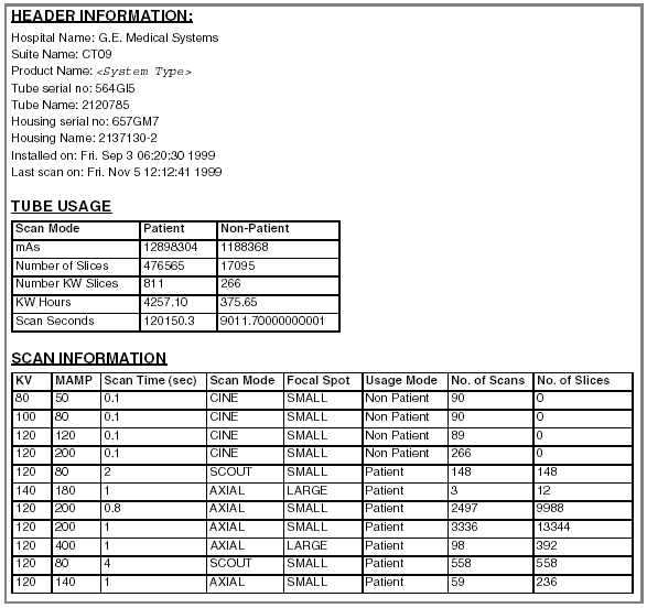 Tube Usage - Tube slice count and use information for the current and previous x-ray tubes.