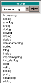 The IOS log files are created and updated by various scanner application software processes. The IOS Logs are normally found within the path /export/home/sdc/logfiles. If a log is present and is of size > 0 bytes, its contents display. Otherwise you see an error message stating that the specified log-file has zero contents.