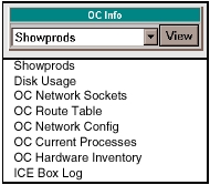 When you select OC INFO and then SHOW LOG!, a new frame for OC Info is opened within the current window. “OC Info” executes basis Linux (or IRIX) commands to gather information used for display. To use, make a selection and select VIEW. The associated Linux (or IRIX) command is executed and the output is directed into the frame immediately below, as HTML (See Table 1).