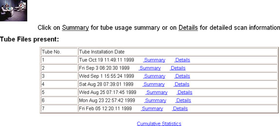 When you select TUBE USAGE and then SHOW LOG!, a new frame is opened. Within the new frame is a list of tube usage files presently available for viewing. The tubes files are displayed from newest to oldest, top to bottom respectively. Three different views of information can be generated by following the hyperlink: Summary, Details, and Cumulative Statistics. See Figure 4.