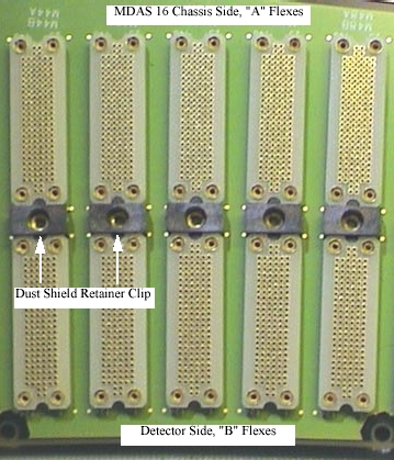 BGA: Circuit board material with female pins pressed in. Used on both the flex leads and DAS 16 backplanes.