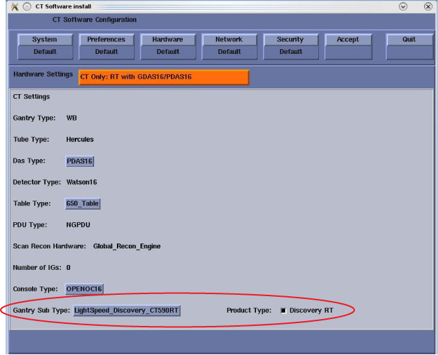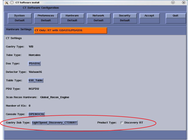 note:For Discovery CT590 RT, MUST toggle Product Type - Discovery RTOFF and select “LightSpeed_Discovery_CT590RT” as Gantry Sub Type.