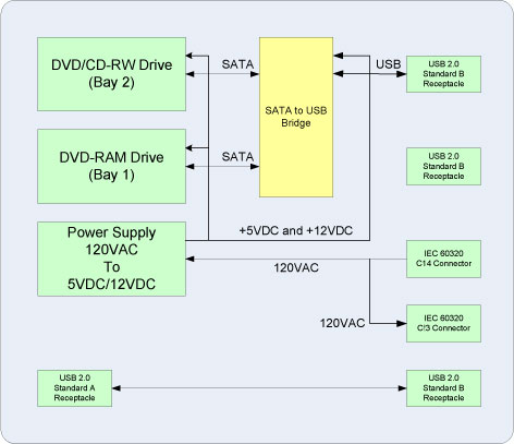 The DVD peripheral Media Tower includes one USB interface DVD-RW drive on the NIO Console. This Peripheral Tower is interfaced to the Host Computer using USB 2.0. The following block diagram shows this interface and the SATA to USB Bridge adapters needed to connect the more commercially available DVD-R/RW Optical Drives.