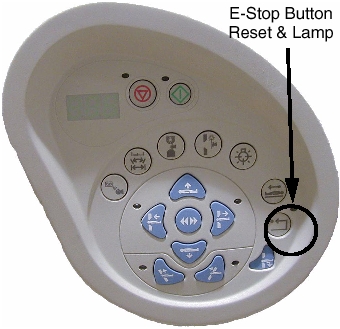 To re-enable (remove the E-Stop condition) the system for operation again, press the reset button on any of the gantry’s control panels or at the console. See Figure 8 , Figure 10 and Figure 11.