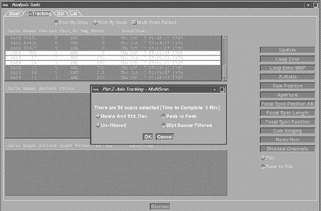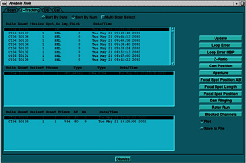 The scan analysis feature allows users to have interactive access to scan files collected on the scanner. Scan data to be viewed can come from either patient scanning or from service mode tools such as Diagnostic Data Collection or Calibration.
