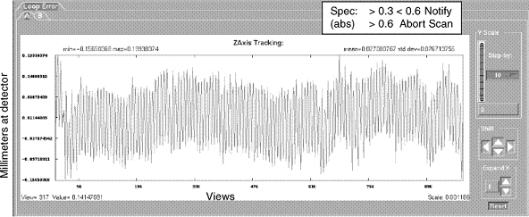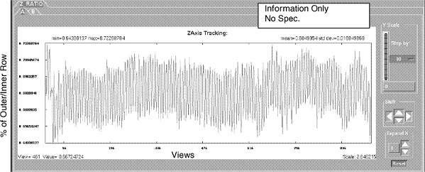 The Z-AXIS TRACKING tool is a new TAB, located within the Analysis Tool. The tool can be used to plot various tracking functions, using a Scan Data Set. For a scan data set, the analysis package can plot different data versus views in UN-FILTERED (the default) or FILTERED (20 pt. Boxcar) formats. Numerical information (“Max”, “Min”, “Mean”, and “Std. Dev.”) is also provided. In some plots, the numerical information provided can be used for further analysis by comparing it to a “specification” value, as an indication of a pass/fail condition. Whereas other plots are more general, and in some cases may be useful, they are typically only used for troubleshooting.