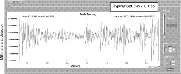 In the figures that follow, examples of “known” tracking plots are shown. Since plots vary from system to system, the examples shown should be used only as guides. Compare your system’s plots and analyze them relative to the specification shown in each figure. The plots shown are UN-FILTERED views, which is the default option when they are plotted. A 20 point boxcar filter takes the 20 view average and then plots the data.