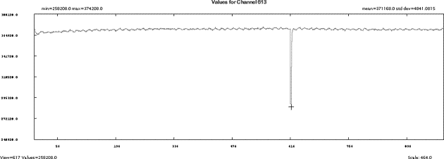 The resultant plots are auto-scaled, and in some cases, the range of data displayed is automatically set. This is to provide a reasonable initial view of the data. Always check the scale on the left-hand side of the plot displays. Cursor reporting of data value and channel numbers is provided.