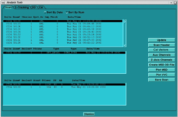 Analysis is divided into three major areas of: SCAN ANALYSIS, dd FILE ANALYSIS, and CAL FILE ANALYSIS. CAL File analysis is not yet available for this system. Each major section provides a file list select interface similar to the Image Works List Select, Image Browser. Analysis List Select allows you to select the appropriate file of interest.
