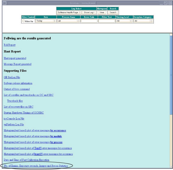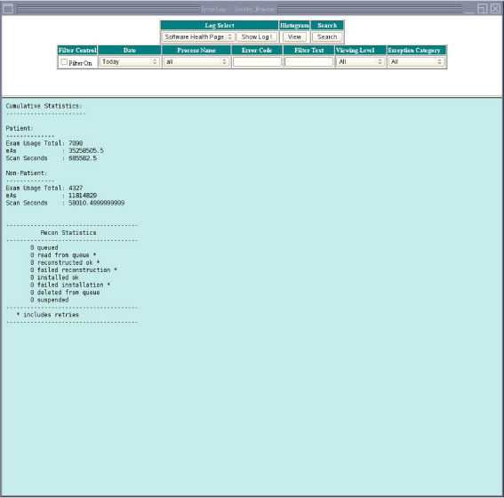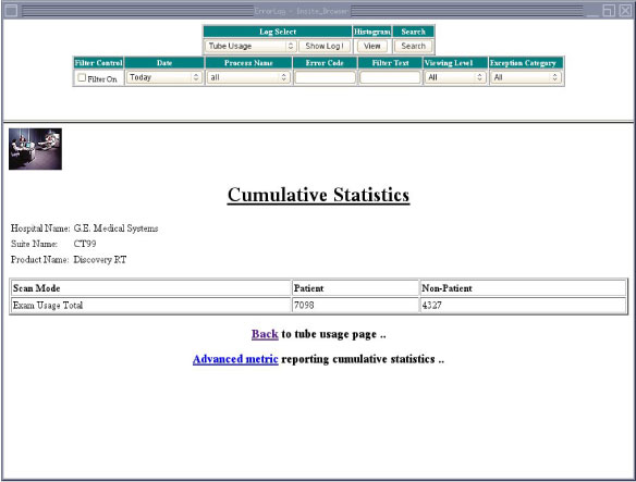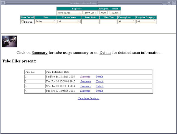You can display the Software Health Page by selecting Software Health Pagefrom the Log Select menu and pressing Show Log. The Software Health Page includes a link to a Cumulative Tube Usage Statistics Screen, as shown in Figure 8.