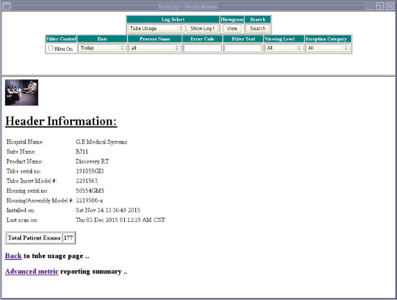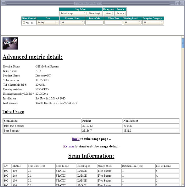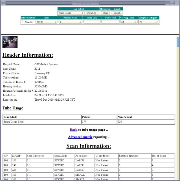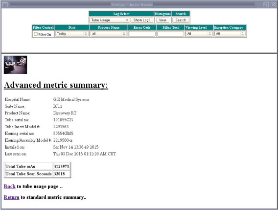 The Tube Usage Default Details Screen includes a link to an Advance Metric subscreen. The Tube Usage Details Advance Metric screen presents the same selected Tube Unit information and Site information, in addition to reporting “Patient Tube mA Seconds”, “Non-Patient Tube mA Seconds”, “Patient Scan Seconds”, “Non-Patient Scan Seconds” and scan details for the selected Tube Unit. (See Figure 6.)
