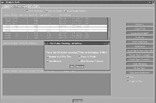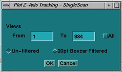 The Z-AXIS TRACKING tool is a new TAB, located within the Analysis Tool. The tool can be used to plot various tracking functions, using a Scan Data Set. For a scan data set, the analysis package can plot different data versus views in UN-FILTERED (the default) or FILTERED (20 pt. Boxcar) formats. Numerical information (“Max”, “Min”, “Mean”, and “Std. Dev.”) is also provided. In some plots, the numerical information provided can be used for further analysis by comparing it to a “specification” value, as an indication of a pass/fail condition. Whereas other plots are more general, and in some cases may be useful, they are typically only used for troubleshooting.