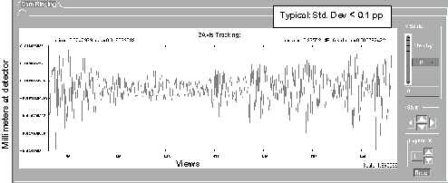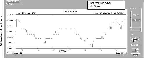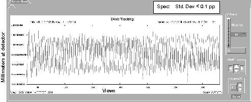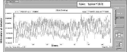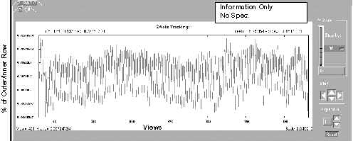 In the illustrations that follow, examples of “known” tracking plots are shown. Since plots vary from system to system, the examples shown should be used only as guides. Compare your system’s plots and analyze them relative to the specification shown in each illustration. The plots shown are UN-FILTERED views, which is the default option when they are plotted. A 20 point boxcar filter takes the 20 view average and then plots the data.