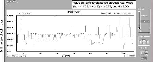 APERTURE plot indicates the width of the Collimator Cam aperture in millimeters. Due to the distance magnification factor, the width at the collimator is smaller than prescribed acquisition mode, or width of the beam at the detector window.