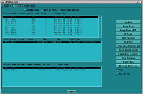The MULTI-SCAN SELECT option allows the user to calculate and view multiple scans. Select the MULTI-SCAN SELECT button, and then select the exams, series, or multiple scans. Once scans are selected, then select the plot that you are interested in. Due to the time it may take, based on the number of scans selected, a pop-up window may appear, to indicate the number of scans selected and the approximate time to calculate. If the time is too long, or wrong scans are selected, hit CANCEL. Once the OK button is selected, you cannot cancel processing.