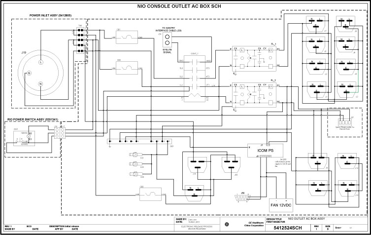 The AC Box in the top compartment of the Operator Console is responsible for distributing AC Power to the components in the Console. Incoming power from the AC Unit (PDU) of the CT System is two (2) phase 208 Vac. This incoming 2 phase AC power is routed through Line Filters and Circuit Breakers and then sent to numerous IEC power outlets in a load balanced manner.