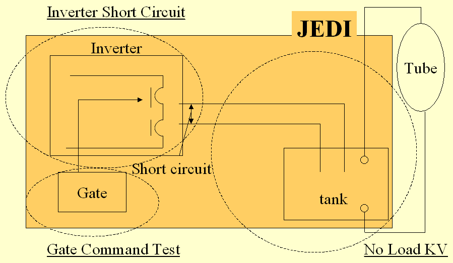 In this test, the inverter is commanded at a fixed frequency and is loaded with a short circuit. Verification is made that inverter currents are correctly set. At the same time verification is made that no high voltage is measured. This test is performed without connecting the HV Tank to the inverter so that no X-ray is generated. Anode rotation and filament drive are not activated during this test. Shorted Inverter Test (Pro16, RT, VCT)