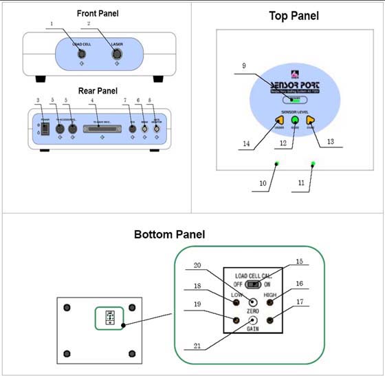 - At the front of the Sensor Port Unit, unplug the Load Sensor from the Load Cell port. (Pull back on the metal sheath to disengage the plug.)