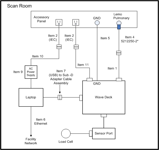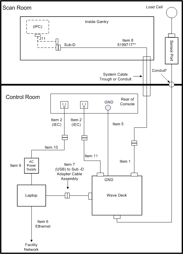 note: If cable 5199717 is NOT present in the cable trough/conduit and cable 5174616 is present, this cable may be used in place of 5199717. If cable 5212250 is present in the cable trough/conduit, it must be replaced with the most current cable (5199717) for the Anzai system to properly function.note: Item 7 is a cable assembly and is shipped as one cable unit by design. These two cables must not be reconfigured in any way.note: The Ethernet connection to Facility network is used for motion file transfer to AW or Console for Advantage 4D application. In case of Prospective gating, this motion file is not needed/not used.