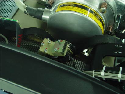 - Rotate the Gantry by hand and recheck tension of washer. Make sure the belt does not slip off tensioning pulley and is tracking correctly toward the rear of the gantry.