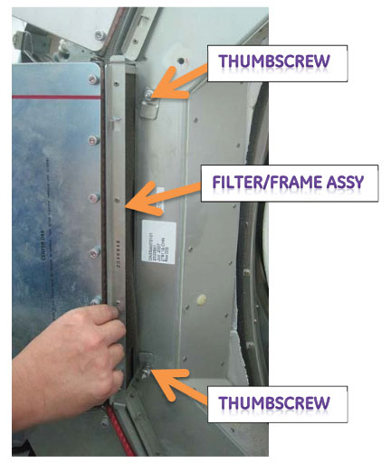 - Re-insert the filter/frame assy into the DAS plenum, and secure it with thumbscrew.