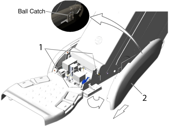 1 Remove two screws. 2 Open the side base cover, and slide it toward the Gantry to release the ball catch. Figure 4. Foot Switch Cover Removal