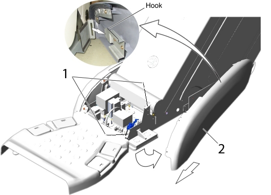 1 Remove two screws. 2 Open the side base cover, and slide it toward the Gantry to release the hook. Figure 3. Side Base Cover (Left) Removal For 5127459/5127460