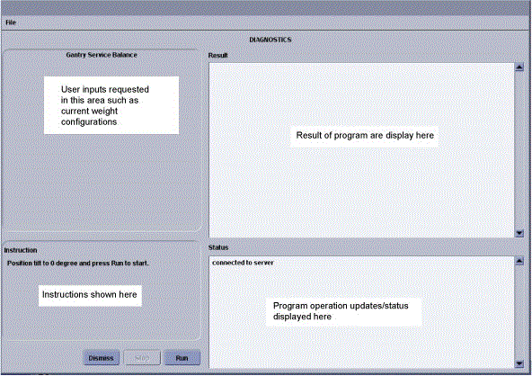 - Select Run to start the gantry balance procedure.note: Follow the on screen instructions exactly as stated. Failure to follow the steps may result in having to start the procedure from the beginning.